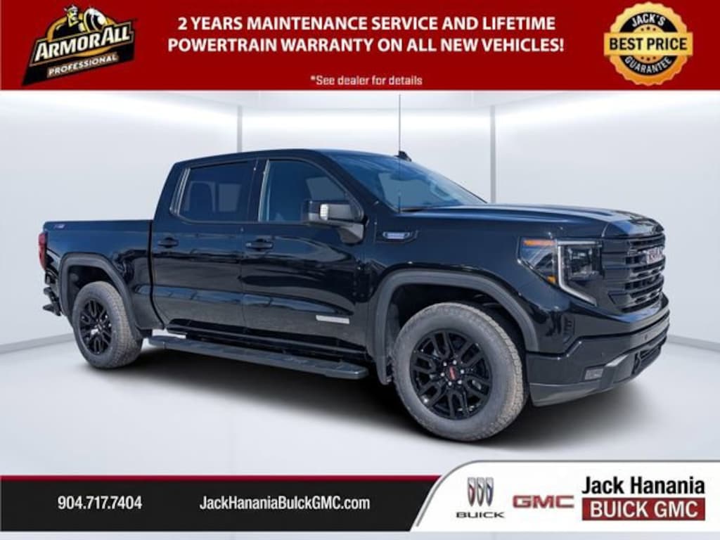 Dealer Discount of $8,368 off MSRP Onyx Black 2026 GMC Sierra 1500 Elevation 22/26 City/Highway MPG 4WD 10-Speed Automatic 3.0L I6 2026 GMC Sierra 1500 Elevation for sale St Augustine, FL, 10-Speed Automatic, 4WD, Black Leather, 120-Volt Bed Mounted Power Outlet, 120-Volt Interior Power Outlet, 2 Charge/Data USB Ports, 2 Type-C Charge-Only Rear USB Ports, 6-Speaker Audio System Feature, Adaptive Cruise Control, Auto-Locking Rear Differential, Color-Keyed Carpeting Floor Covering, Deep-Tinted Glass, Dual Exhaust System, Electric Rear-Window Defogger, Elevation Premium Package, Front Frame-Mounted Black Recovery Hooks, Front Rubberized-Vinyl Floor Mats, HD Rear Vision Camera, HD Surround Vision, Heavy-Duty Air Filter, High Capacity Suspension Package, High Gloss Black Mirror Caps, Hill Descent Control, Hitch Guidance, Hitch View, Integrated Trailer Brake Controller, Leather-Appointed Seat Trim, LED Cargo Area Lighting, Navigation System, Off-Road Suspension, OnStar Services Capable, Perimeter Lighting, Power Door Locks, Preferred Equipment Group 3SB, Preferred Package, Premium Bose 7-Speaker Sound System, Push Button Start, Rear Cross Traffic Braking, Rear Pedestrian Detection, Rear Rubberized-Vinyl Floor Mats, Rear Wheelhouse Liners, Remote Vehicle Starter System, Sierra Safety Plus Package, Steering Wheel Audio Controls, Trailer Camera Provisions, Trailer Side Blind Zone Alert, Trailering Package, Universal Home Remote, Wi-Fi Hotspot Capable, X31 Hard Badge, X31 Off-Road Package.Email, call, or stop in today! Jack Hanania Buick GMC, the difference is we offer a transparent buying experience. Prices are PLUS tax, tag, title fee, $994 Pre-Delivery Service Fee and $398 Electronic Tag Registration Service Fee and dealer installed options (see dealer for details). Customer must trade-in a vehicle to receive $1,500 Trade Assist credit. Financing must be provided by a third-party lender using this dealership's assistance for Customer to receive $1,500 Financing Assist credit. The final online sale price and Jack's Discount includes trade in and financing assist credits. Pre-owned vehicle pricing excludes any mechanical and cosmetic reconditioning expenses or vehicle transport and acquisition costs to the Dealership from factory sales, which amount will vary depending on the vehicle. Some New and Used trucks are upfit with aftermarket lift kits, custom wheel and tire packages, that are not included in the online sales price. Vehicles with lift kits, custom wheel and tire packages, tint and ceramic coating will be added to the sales price. All prices, specifications, and availability subject to change without notice. Contact dealer for most current information. All advertised pricing is on in-stock units only and includes all applicable dealer discounts, manufacturer discounts, and incentives. Certain offers and incentives presume financing through the Manufacturer Captive Lender, subject to approved credit. Should you purchase the vehicle through the use of other funds or through other lending sources, certain offers and rebate incentives may be excluded. Due to supply chain challenges and limited inventory, vehicles may be subject to an additional market adjustment depending on inventory production, availability and market conditions. Please see dealer for details. 22/26 City/Highway MPG